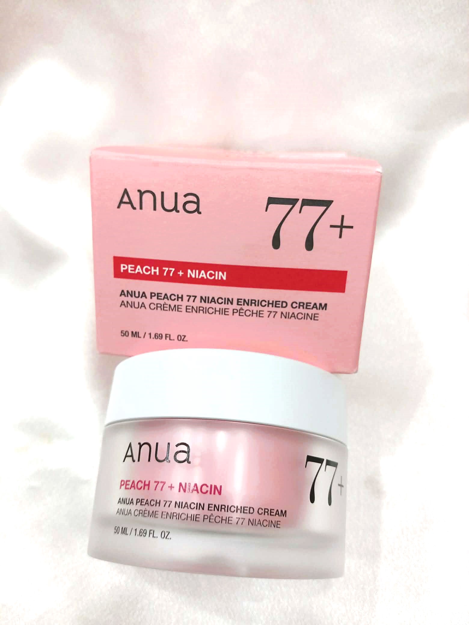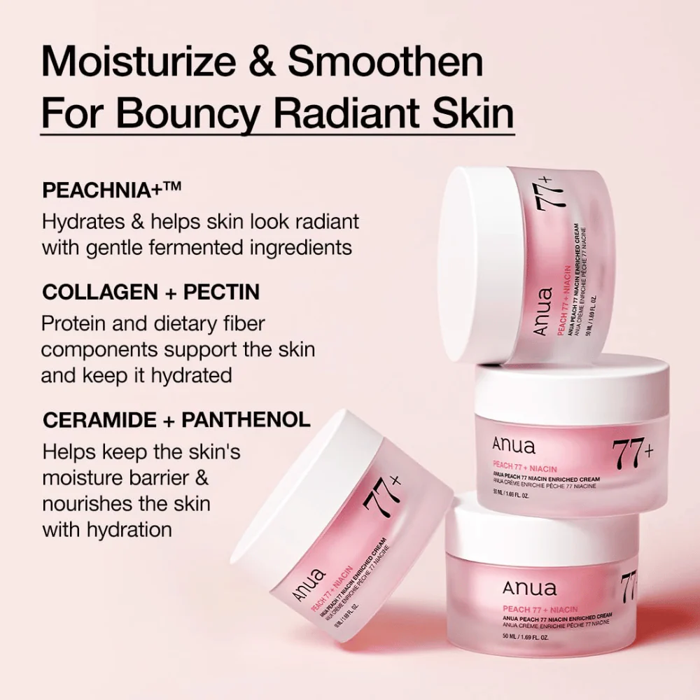 Anua Peach 77 Niacin Enriched Cream  is a nourishing, pudding-like gel moisturizer designed to brighten, firm, and deeply hydrate skin using 77% Prunus Persica (peach) fruit extract, niacinamide, ceramides, and collagen. It absorbs quickly without stickiness, suitable for all skin types, and strengthens the skin barrier.