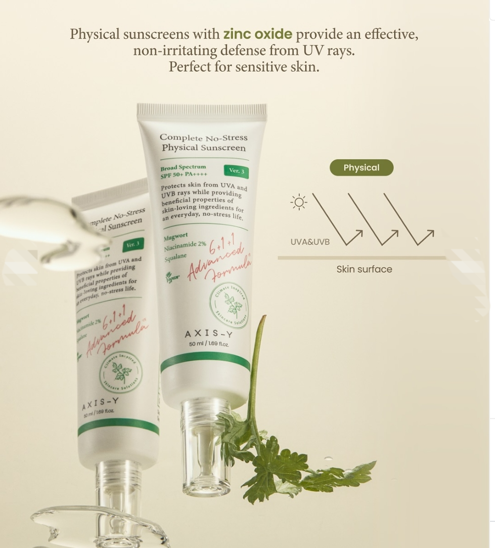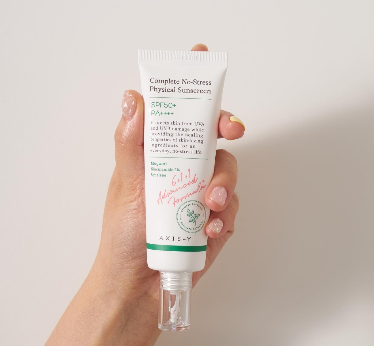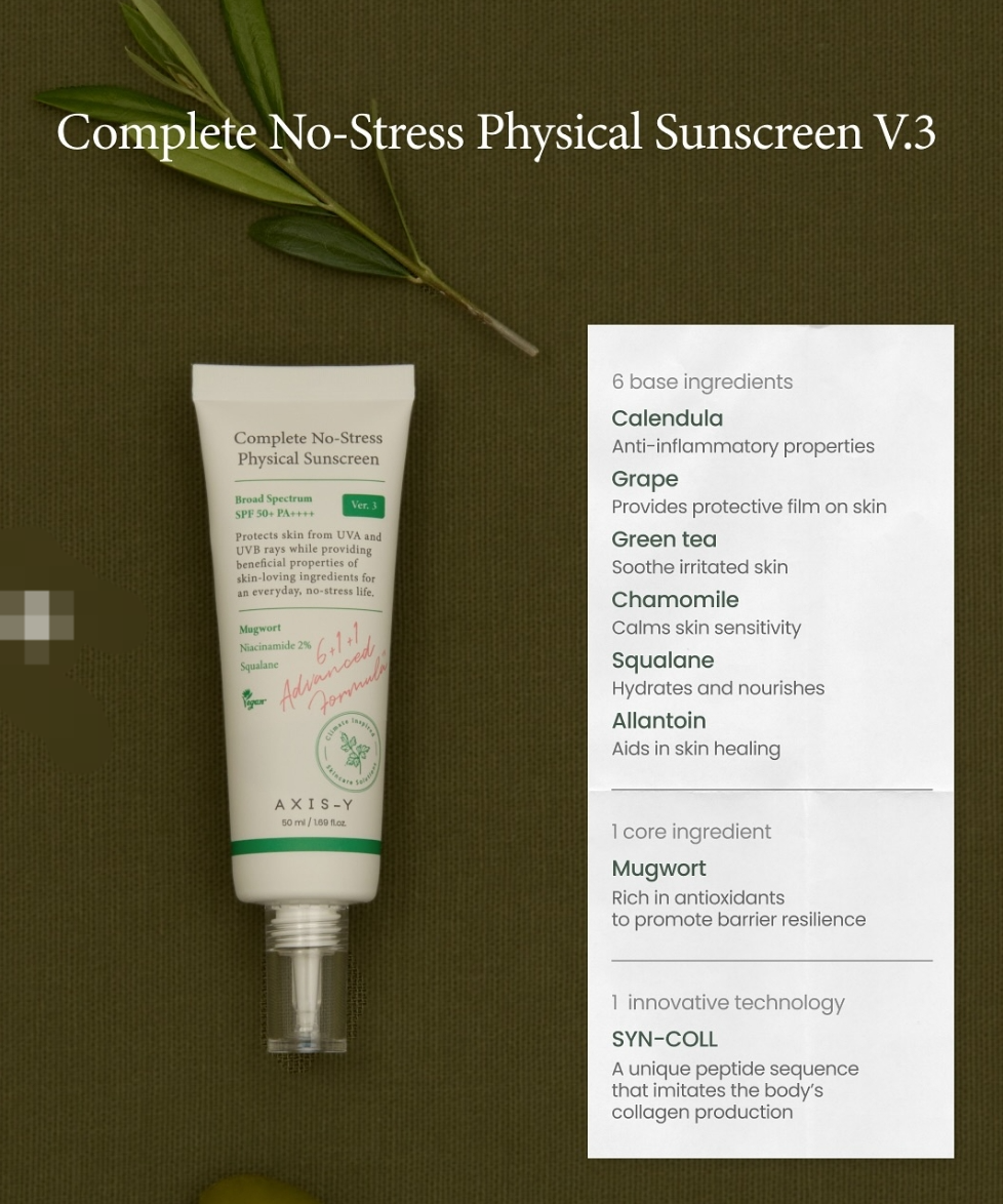 AXIS-Y Complete No-Stress Physical Sunscreen V.3 is a lightweight, SPF 50+ PA++++ mineral sunscreen designed for sensitive and acne-prone skin. It features mugwort, 2% niacinamide, and squalane to soothe, brighten, and hydrate without leaving a white cast or greasy residue. The upgraded formula offers a non-sticky,, fast-absorbing, and reef-safe daily sun defense.