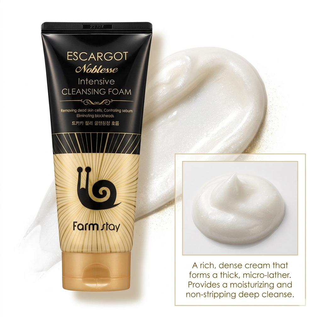 Farm Stay Escargot Noblesse Intensive Cleansing Foam is a designed to deeply remove makeup and impurities while providing moisturizing and anti-aging benefits. Enriched with snail secretion filtrate, it promotes skin regeneration, boosts elasticity, and keeps skin hydrated, soft, and comfortable without causing post-cleansing tightness.