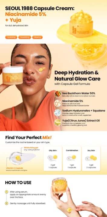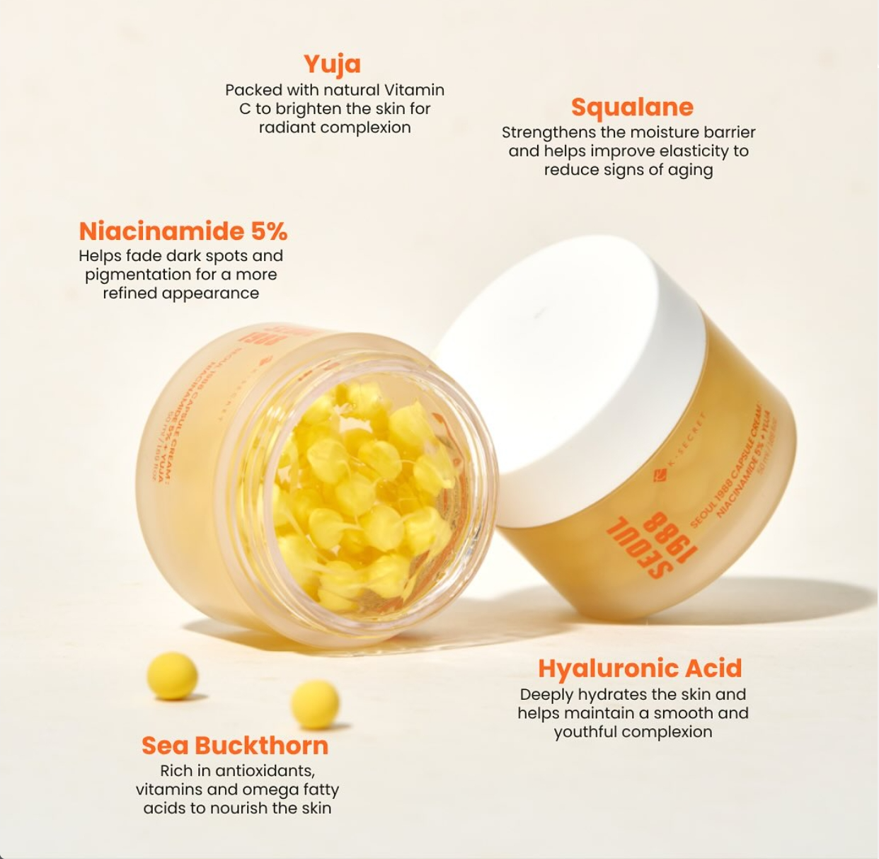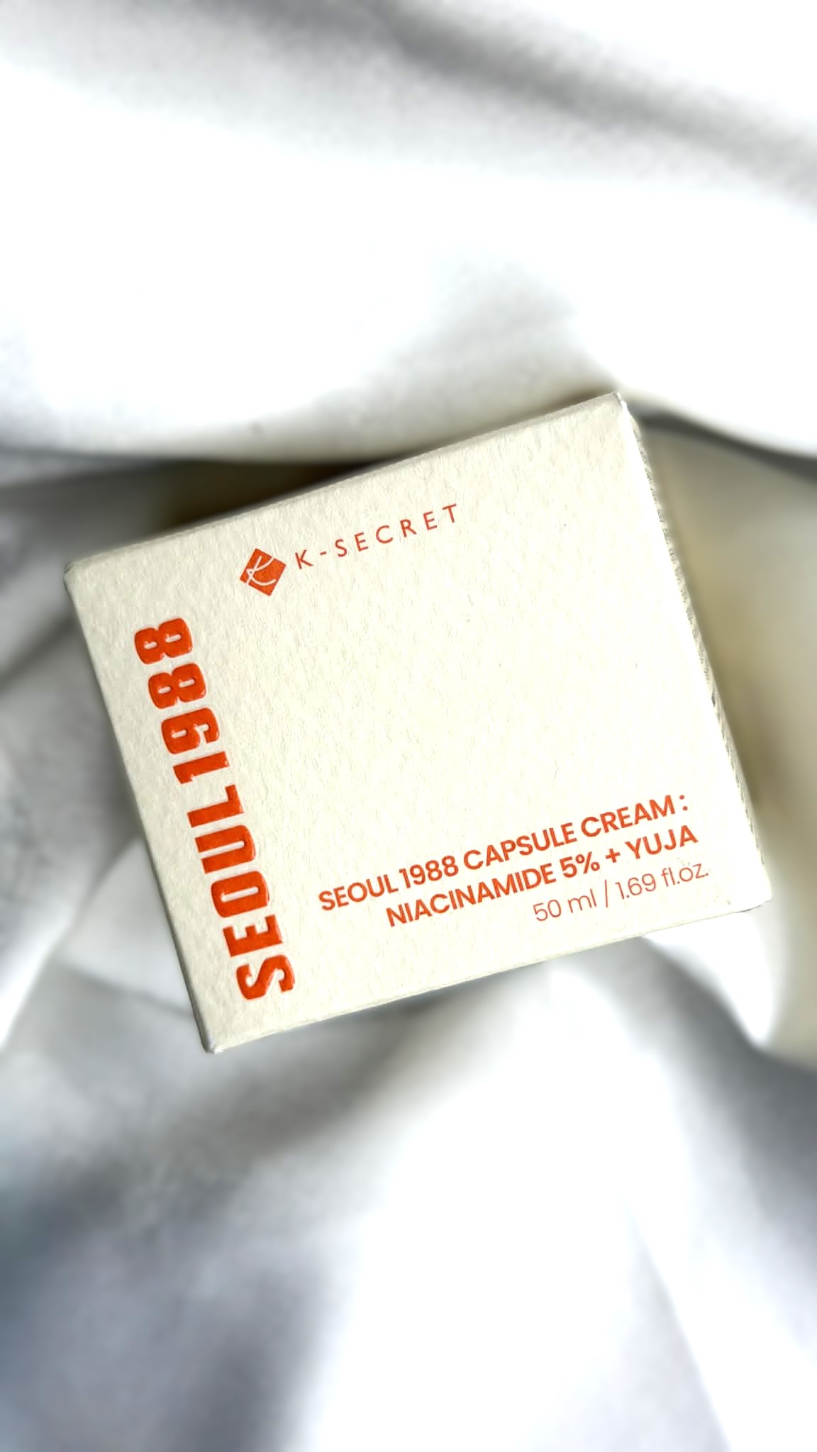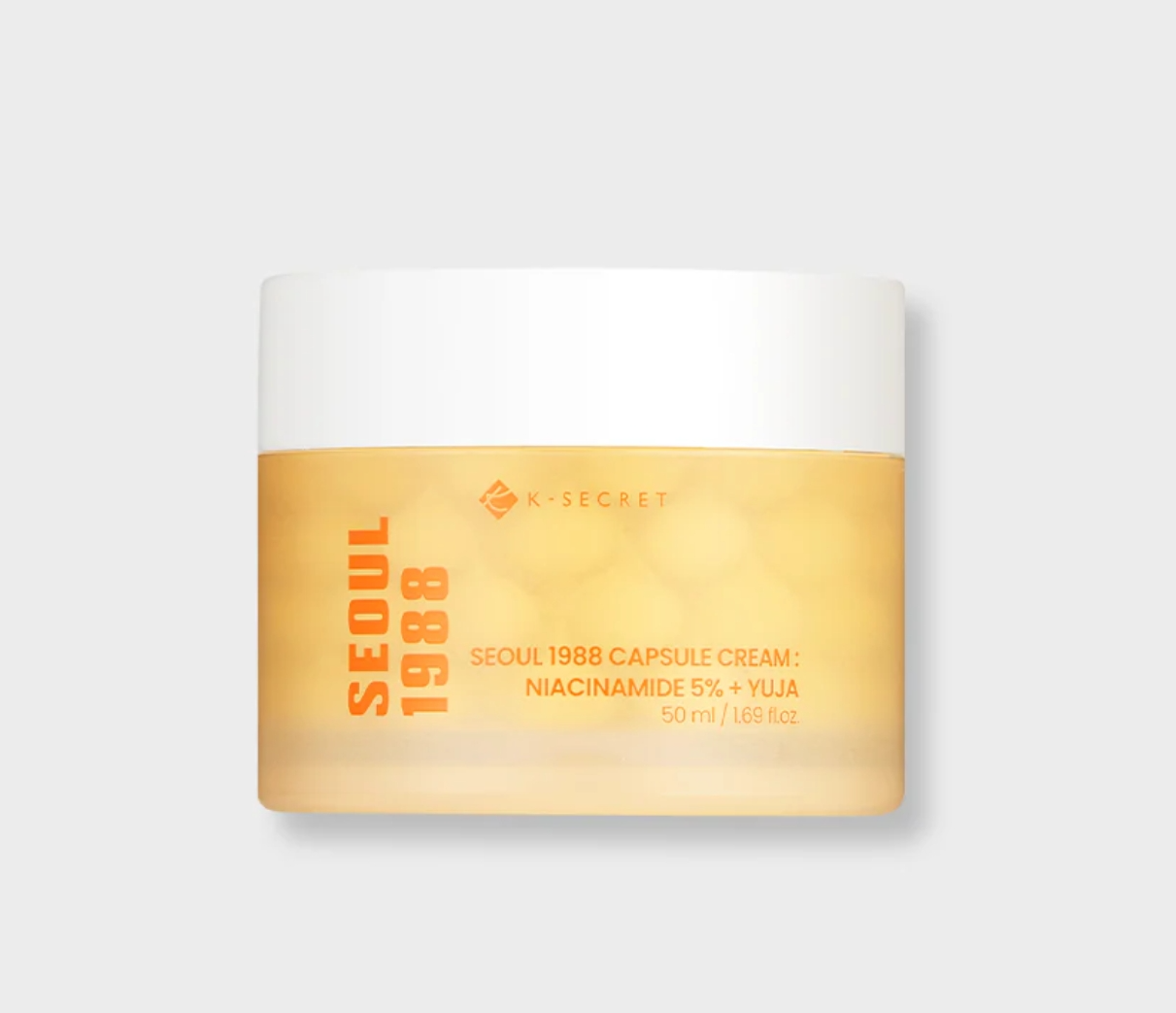 K-Secret Seoul 1988 Capsule Cream (Niacinamide 5% + Yuja) is a brightening and hydrating, all-in-one, dual-textured gel-cream designed to combat dullness, dark spots, and dry skin