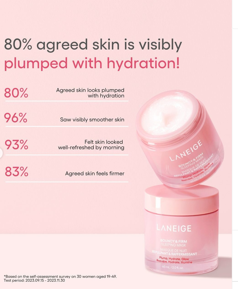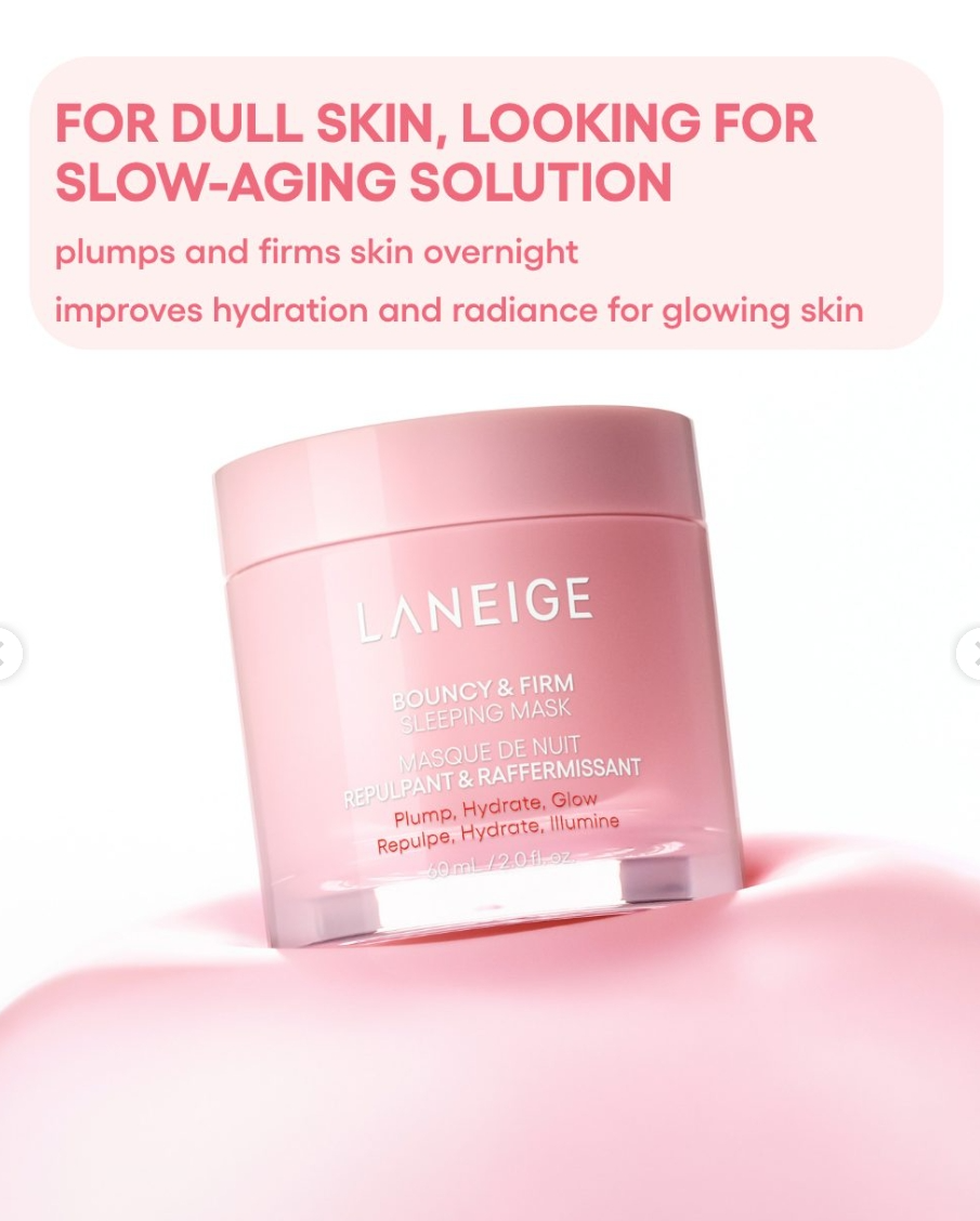 Laneige Bouncy & Firm Face Sleeping Mask is an intensive overnight treatment that deeply nourishes and firms the skin while you sleep. Designed to improve skin elasticity, hydration, and resilience, it helps achieve a plump, youthful complexion by morning.