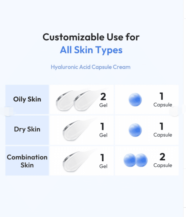 2. Innovative Texture: Combines a refreshing, transparent gel with blue capsules, allowing for a customized mix based on skin, with options to use more capsules for dry skin or more gel for a lighter, non-greasy feel.