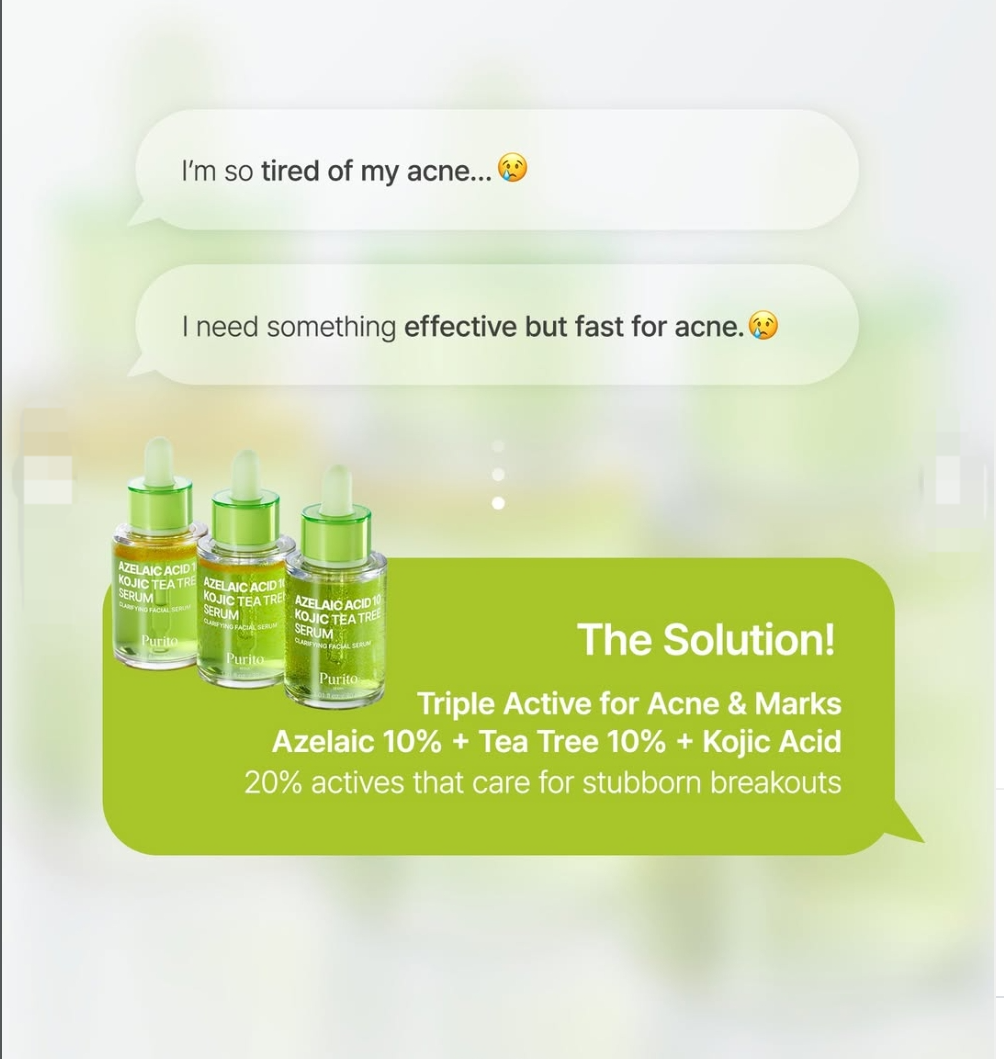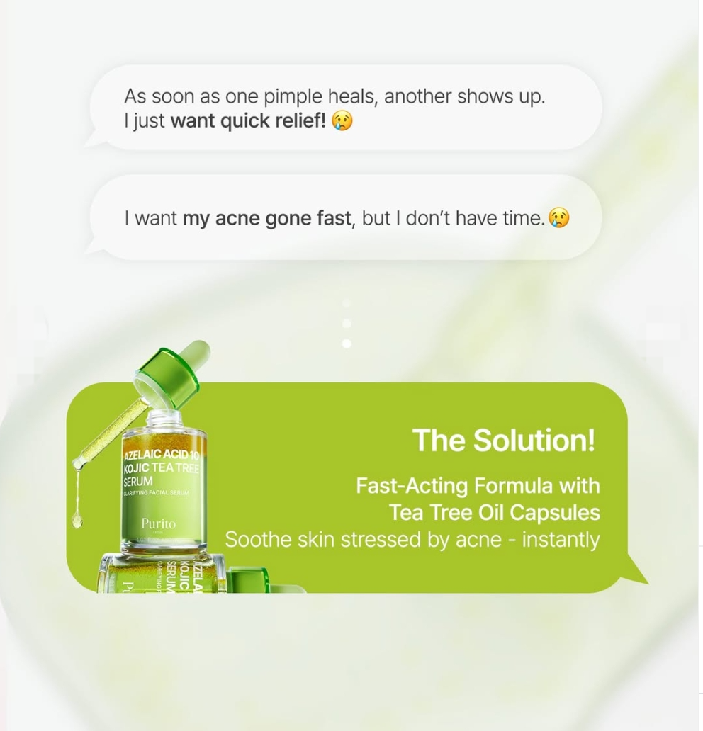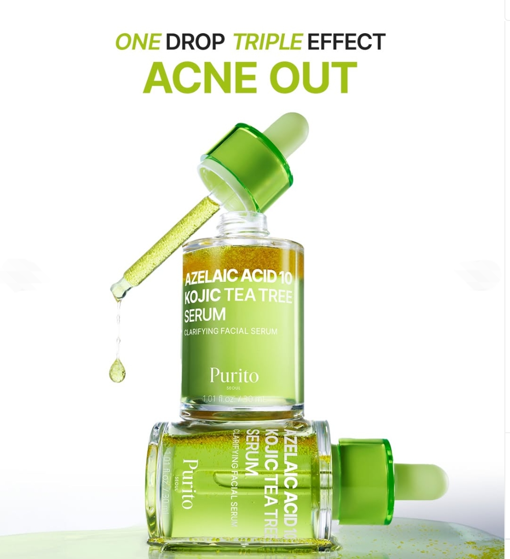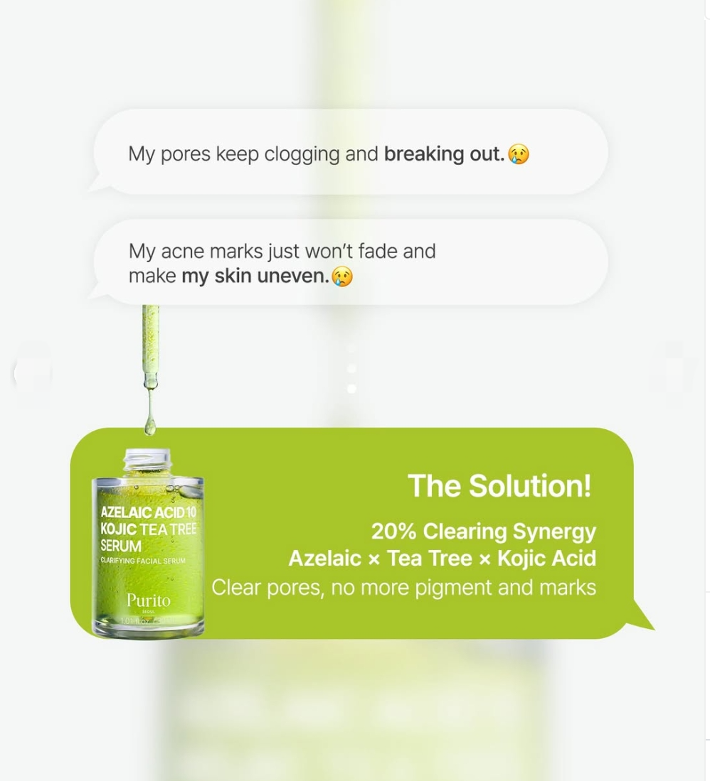 Purito Azelaic Acid 10 Kojic Tea Tree Serum is a lightweight, Serum designed for acne-prone skin, targeting breakouts, redness, post-acne marks, and uneven tone with potent ingredients like 10% Azelaic Acid, Kojic Acid, and Tea Tree Oil, providing gentle exfoliation, brightening, and soothing effects for clearer, balanced, and smoother skin.
