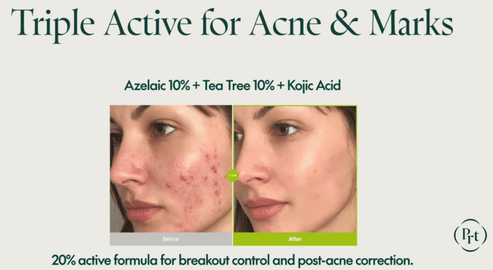 1. Fights Acne & Breakouts: Azelaic acid and tea tree work to unclog pores, kill acne-causing bacteria, and reduce active pimples.