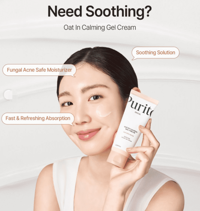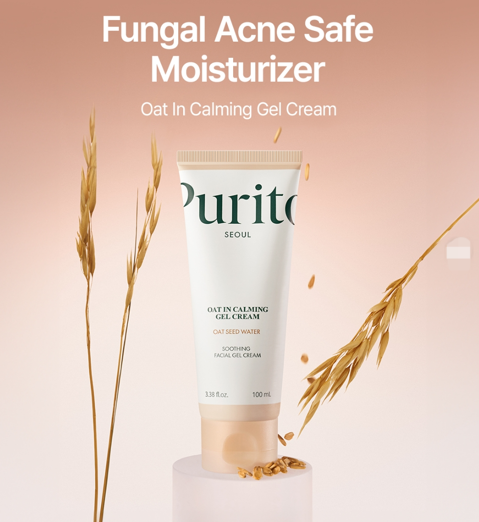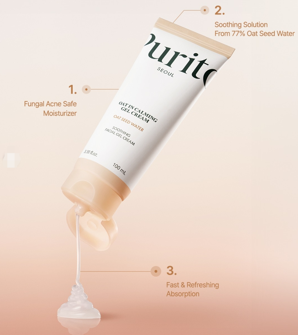 The Purito Seoul Oat-in Calming Gel Cream provides fast, lightweight hydration, soothes redness and irritation with 77% Oat Seed Water, strengthens the skin barrier using Panthenol and Squalane, and offers non-greasy, non-comedogenic comfort, making it ideal for sensitive, oily, or combination skin, including fungal acne-prone skin.
