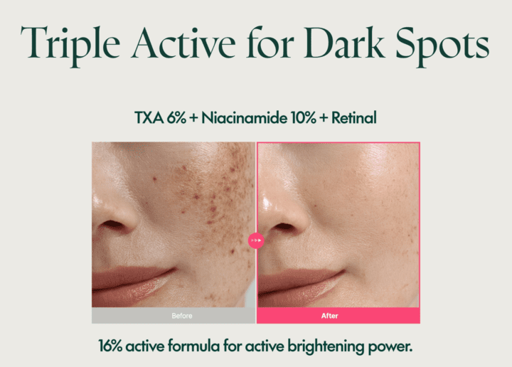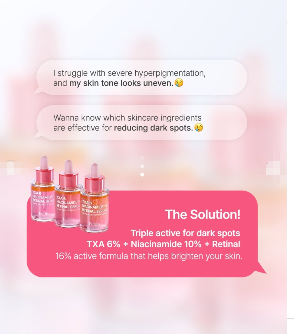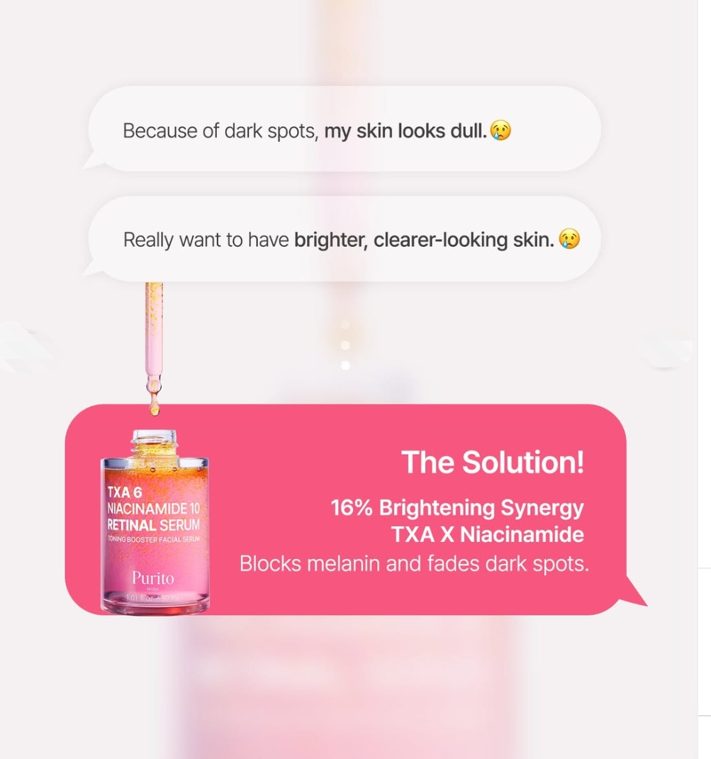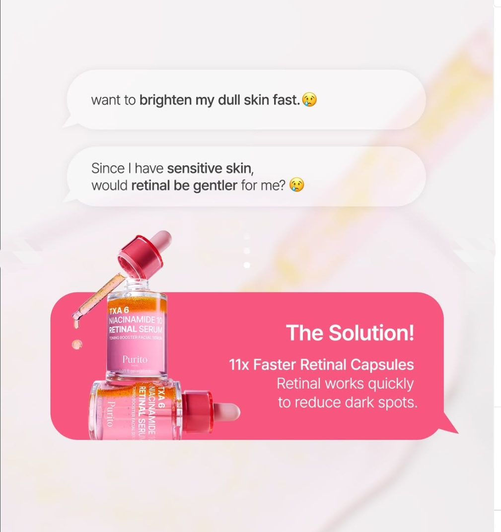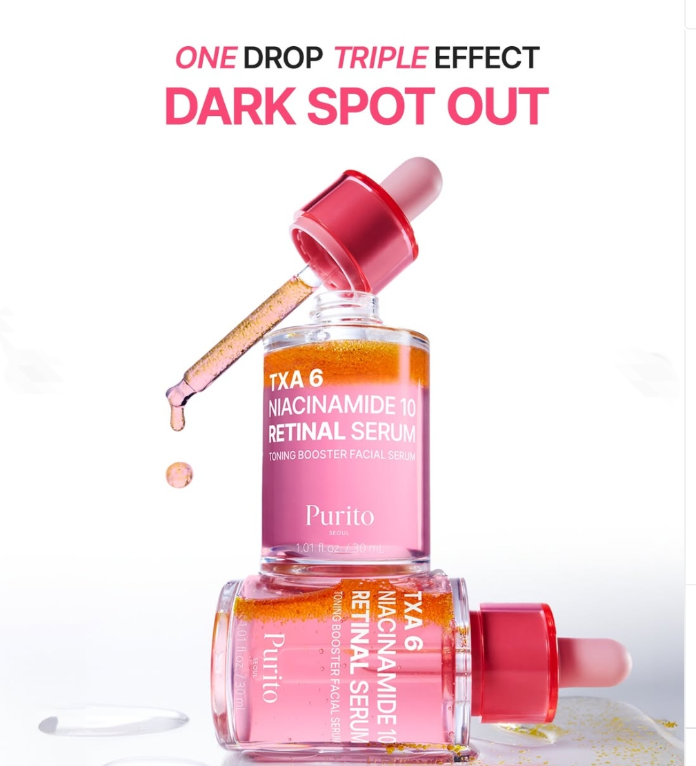 Purito TXA 6 Niacinamide 10 Retinal Serum is that combines 6% Tranexamic Acid (TXA), 10% Niacinamide, and encapsulated Retinal to target dark spots, hyperpigmentation, dullness, fine lines, and uneven texture for a brighter, smoother, more radiant complexion.
