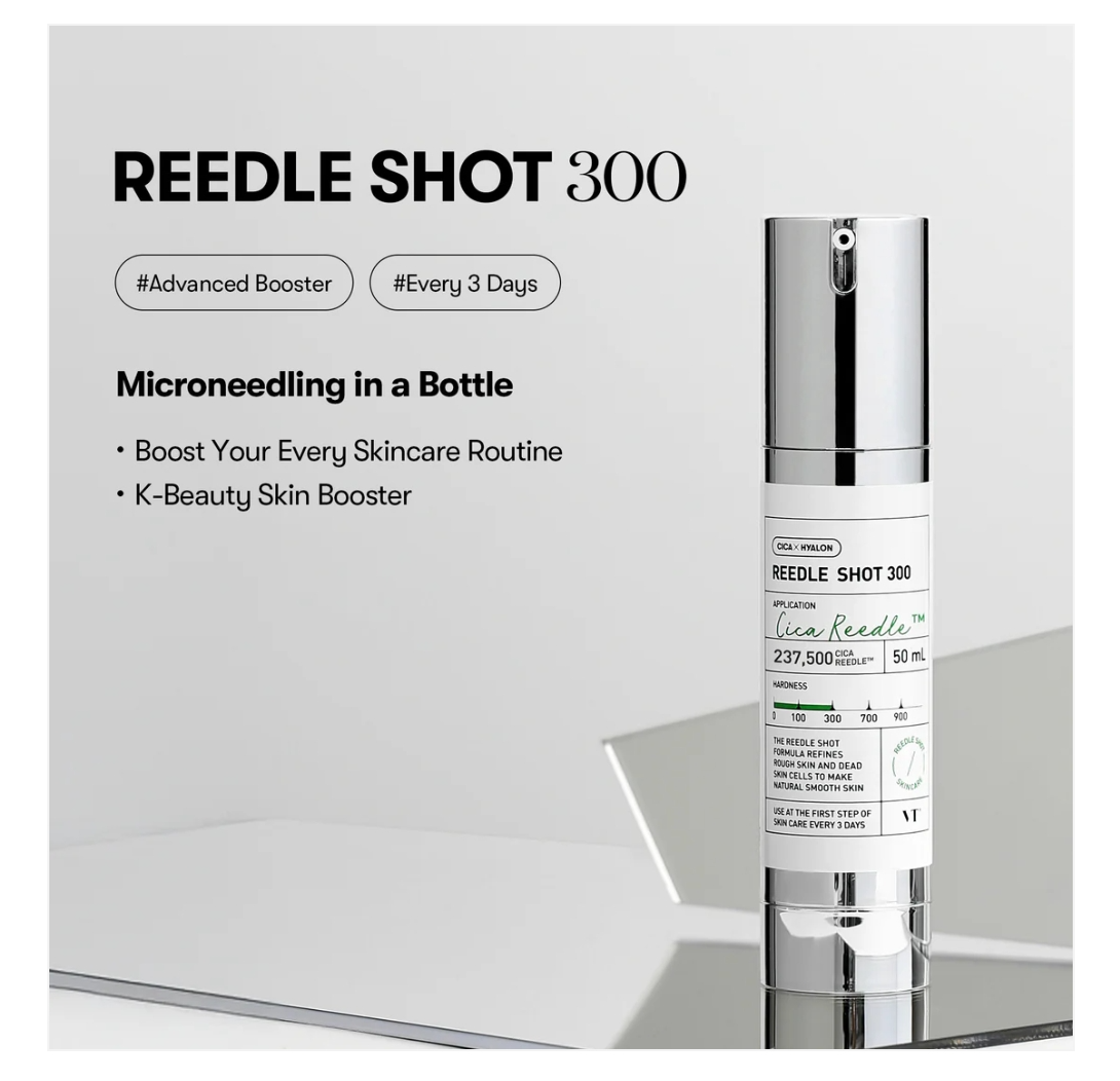 VT Reedle Shot 300 is an intensive, once-every-3-days nighttime essence that uses 237,500ppm of micro-sized Cica Reedle™ (purified silica) to boost absorption of skincare nutrients by 14 times, significantly improving skin texture, refining pores, and providing a hydrating, smoothing effect for a, glowing “glass skin” look.